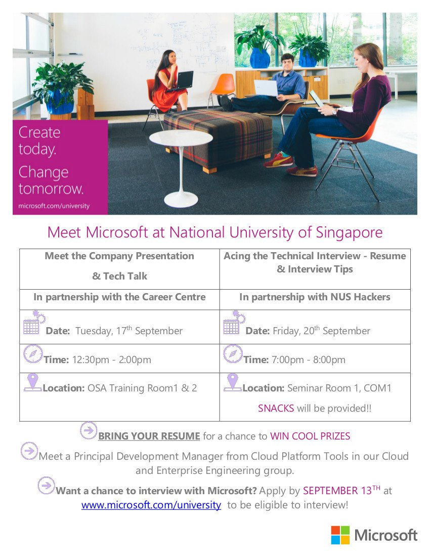 This week we have a talk by Microsoft. Do note that we’ll be in Seminar Room 1, COM1 (NUS School of Computing) instead of at University Town for this session!